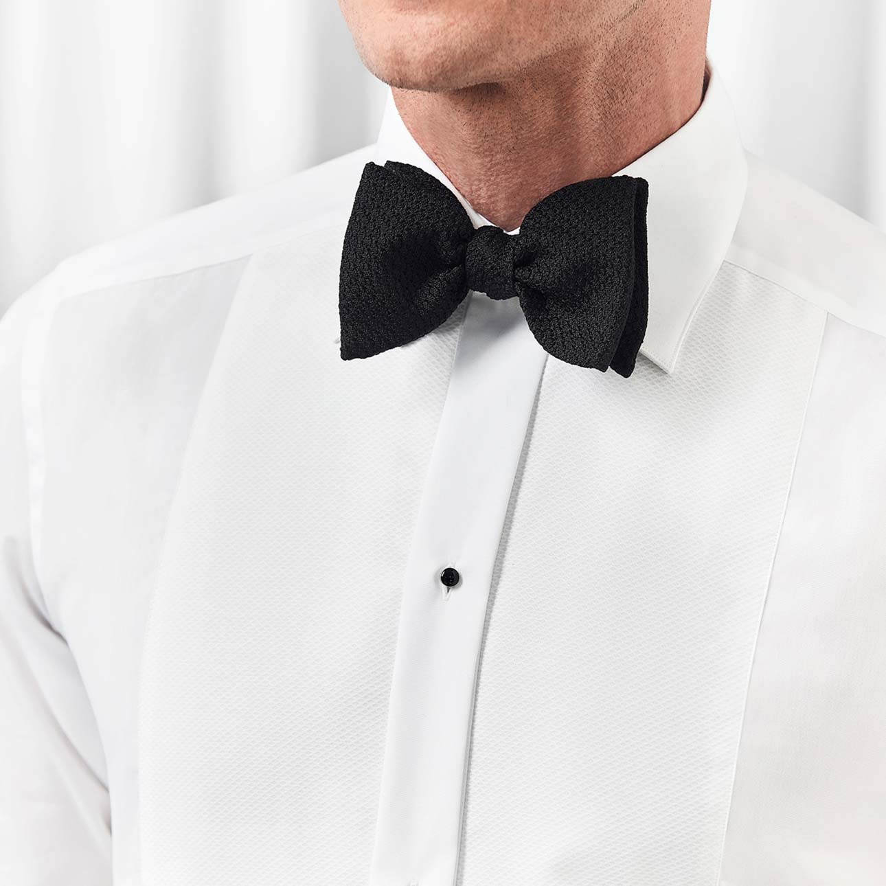 The pique fabric is very popular for black tie shirt due to its ability to stay sharp through full nights of wear and its elegant texture. This style is crafted with a pique front and features our evening cut away collar, black stud buttons and French cuffs. Perfect to match with a timeless and traditional as well as a modern and trim black tie outfit. Removable stud buttons. - Black tie shirt with pique front - Black stud buttons - Timeless black tie shirt