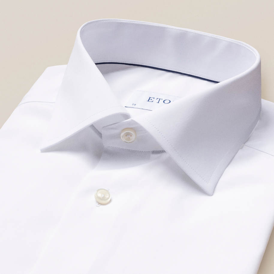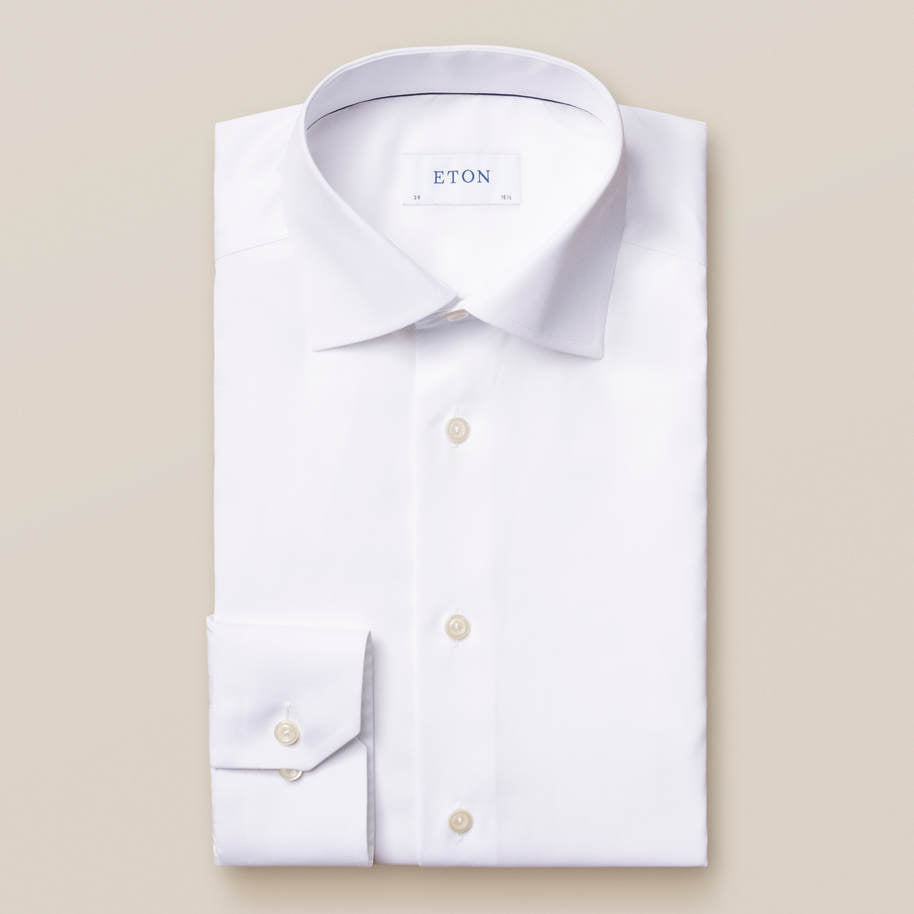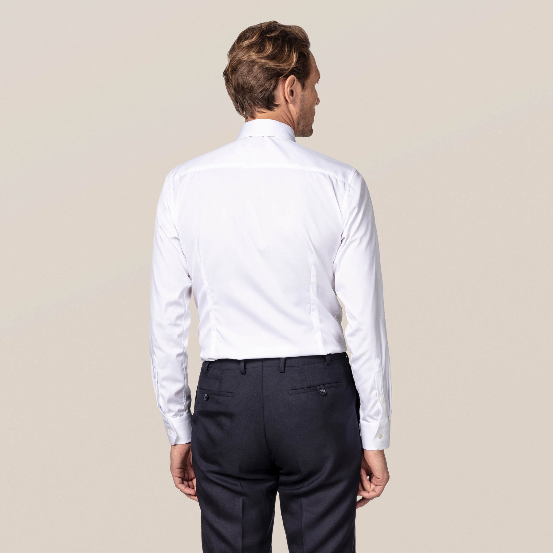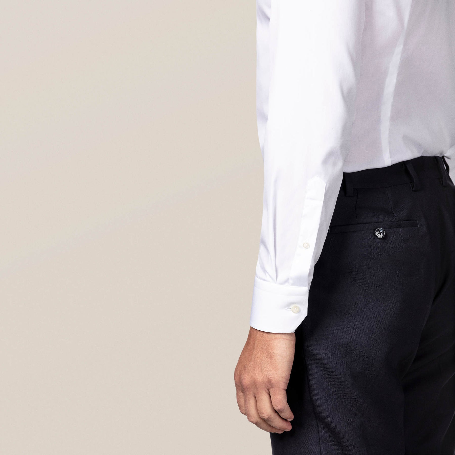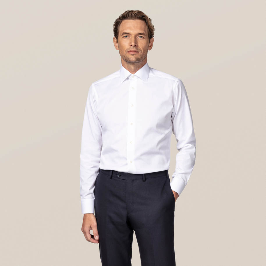 The white poplin shirt is a true classic in every man’s wardrobe. The versatile and crisp poplin fabric offers a sophisticated and clean look all day. Wear it with a tailored suit and our grenadine tie for a sharp look at the office or mix it up with a pair of cotton trousers and a fine knit sweater for the late-night dinner with friends.